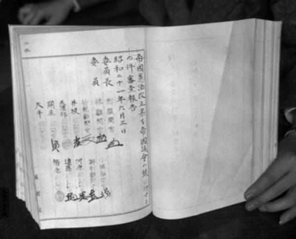 1952年5月,由裕仁天皇和政府部长签署的颁布日本战后宪法的诏书。(每日)