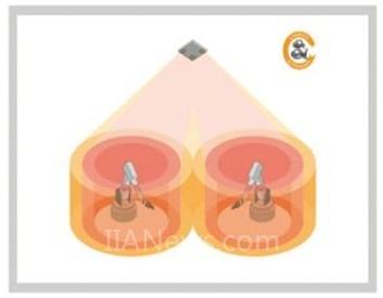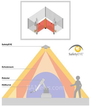 安全照相系统的SafetyEYE包含两个相互作用的单元:传感装置包含照相机和分析单元,分析单元用以分析图像信息并且通过一个可编程的安全控制系统提供一个自动化的界面。照相机每秒钟能记录下多个图像信息用于计算目标的物理位置,然后将其与检测区域和警告区域进行比较,根据不同的比较结果可以设定不同的输出,并且可以通过安全的总线系统SafetyBUS p和未来的SafetyNET p进行设置。SafetyEYE是在三维视觉理论的基础上发展起来的,它要形成一个真实空间中目标的图像信息至少需要来自两个角度的信息,就像人的两只眼睛一样,SafetyEYE需要一些传感器也就是一些照相机来保证获取所需的信息。SafetyEYE配置了三个照相机为的是能够获取所有情况及每个可能的可视和实际情况下的图像信息。人眼之间的距离能够与SafetyEYE镜头间的距离相比较。由于所有静态和动态的目标都可以被监控,单个的照相机必须同时采集信息,SafetyEYE的传感装置每秒钟可以采集20个图像信息,通过光纤电缆传输到分析单元,随着单个照相机间的距离的确定也建立起深度效果。灵活的设计使得风景显得相对平坦,例如,对于一个具体的应用,基本距离间的结构设计,镜头的布局以及照相机的像素都应该作为参考,用以确定最小的可发觉的目标的大小。